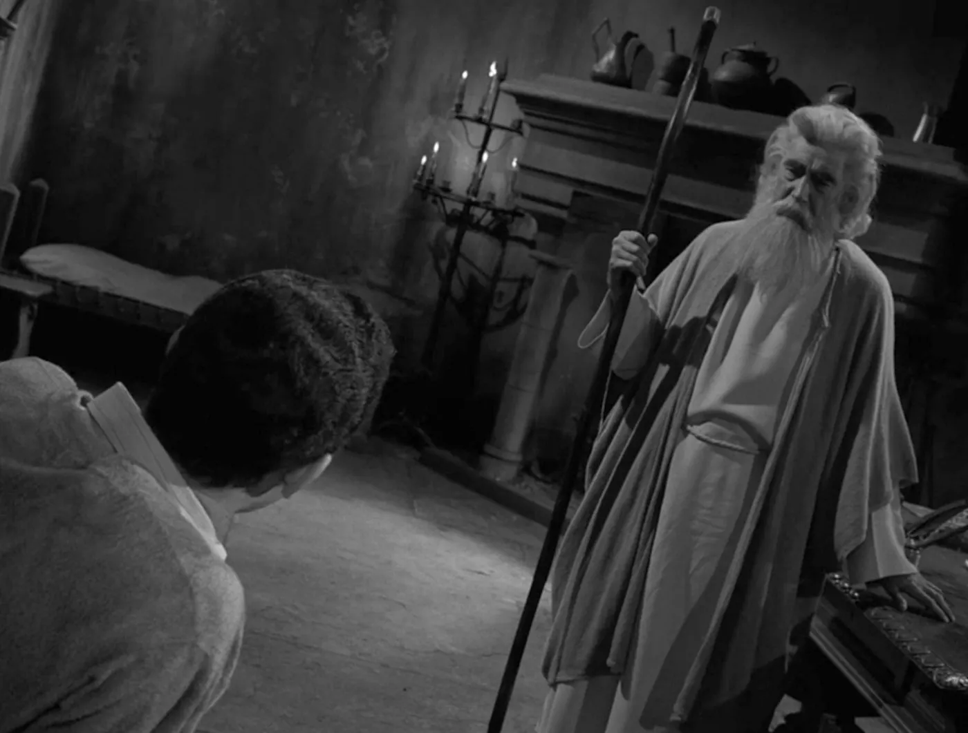 The Christian imagery here is prevalent but perhaps not dense. Brother Jerome sports a shepherd’s crook and robes; his keeping the devil from mankind is played as a straight allegory for Jesus. The staff of truth — which was to have been a cross in the original script (but notably not the original short story, both of which were written by Charles Beaumont)—is another shepherd’s crook.